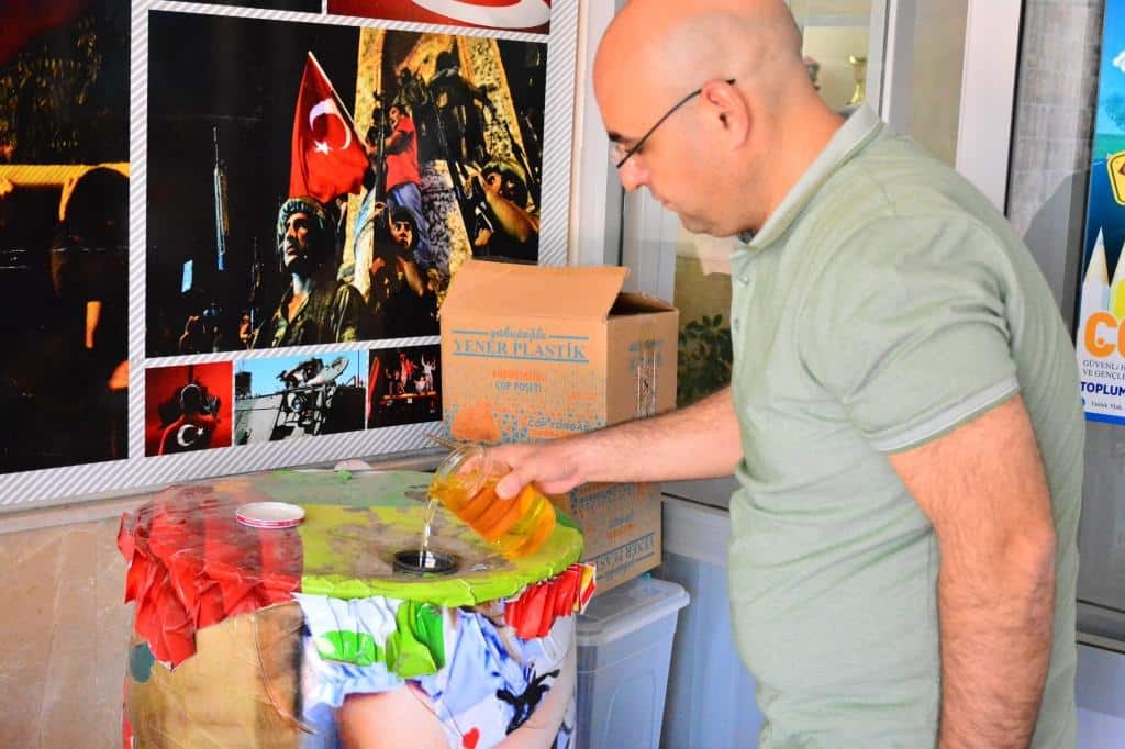 Velilerimiz evsel atık olan yağları okulumuza getirerek çevreye olan duyarlılıklarını gösteriyorlar. Velimiz Serkan KIRKIL'a örnek davranışından dolayı teşekkür ederiz.